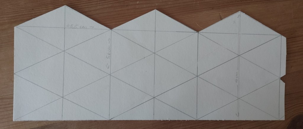 - Skizziere deinen Kaleidozyklus, Breite gesamt 35 cm, 6x 5,5 cm und rechts außen 2cm für eine Klebestreifen zur Verbindung, Höhe gesamt 14 cm, punktiere die vertikalen Linien jeweils bei 5,6 cm und verbinde alle Punkte miteinander, die oberen Ecken schneidest du aus, so dass du am Ende, wie im Bild, dein fertiges Rohmodell hast.